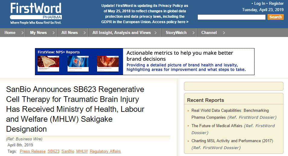SanBio宣布其再生細(xì)胞療法SB623治療創(chuàng)傷性腦損傷,獲得日本厚…